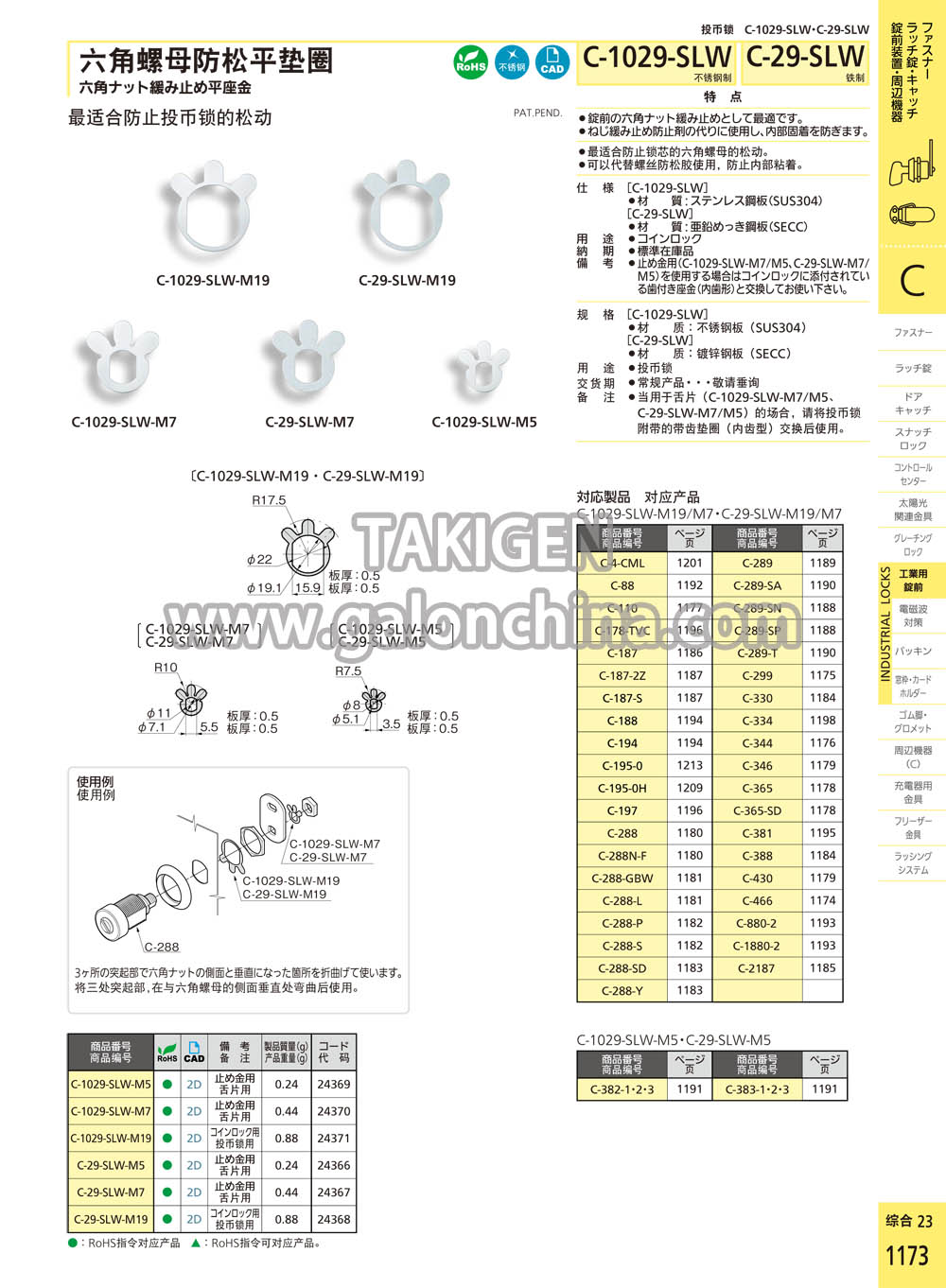 备 注·当用于舌片(C-1029-SLW-M7/M5、C-29-SLW-M7/M5)的场合,请将投币锁附带的带齿垫圈(内齿型)交换后使用。